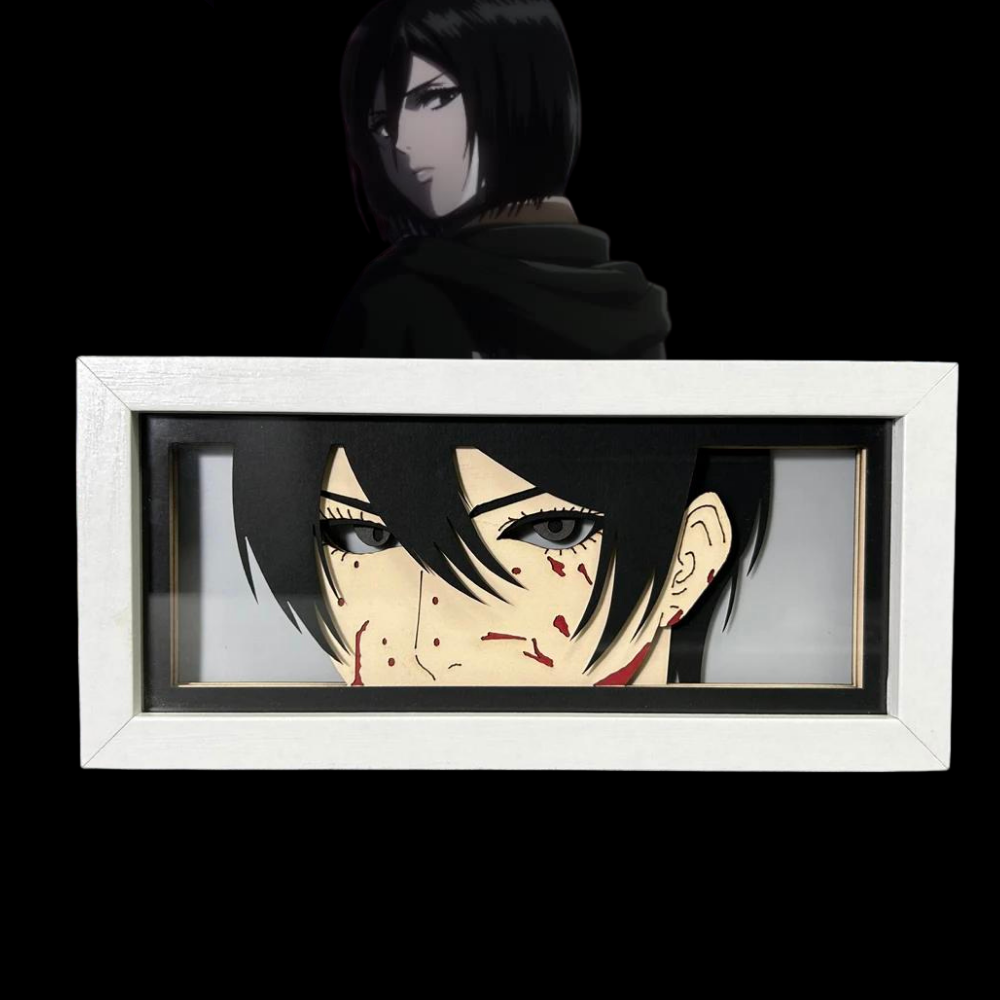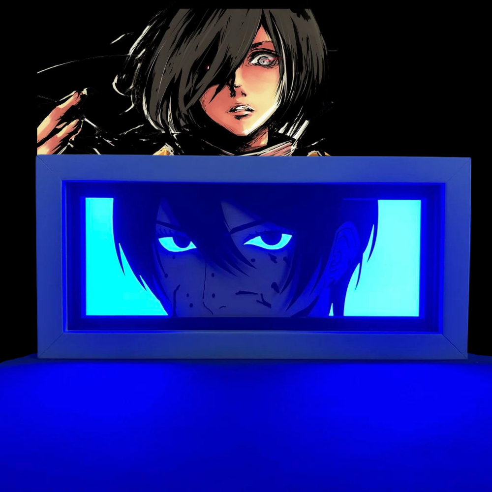 Cette LightBox rend hommage à Mikasa Ackerman, symbole de détermination et de force dans "L'Attaque des Titans". Le visage de Mikasa, éclairé par une lumière bleue intense, reflète sa résolution et sa fidélité sans faille envers ceux qu'elle aime. L'aura qui l'entoure évoque son habileté au combat et sa volonté de protéger l'humanité contre toute menace, faisant d'elle l'un des personnages les plus puissants et emblématiques de la série.