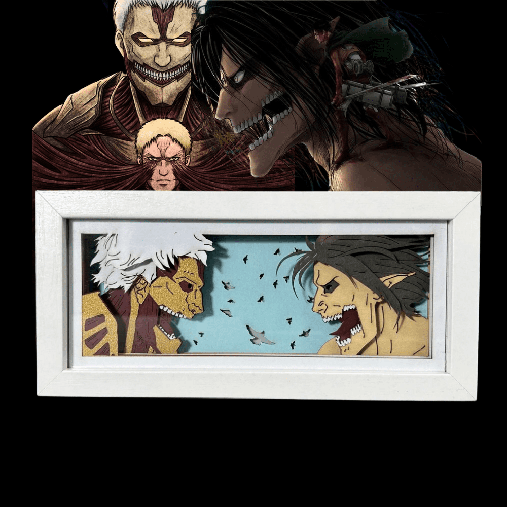 Découvrez la LightBox Titans, une pièce d'art captivante qui saisit l'essence même des affrontements épiques dans "L'Attaque des Titans". Cette lumière décorative met en scène les Titans colossaux engagés dans une bataille intense, se détachant sur un fond bleu glacial qui accentue l'urgence et les enjeux dramatiques de leurs luttes pour la survie et la liberté.